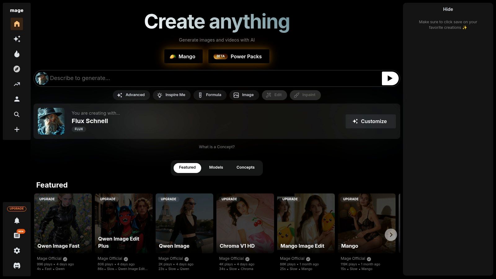 What sets Mage.space apart is its focus on community and customization. The platform not only allows you to generate images but also to browse a public feed, see the prompts and models others are using, and apply them to your own creations. While the free tier can experience queues during peak times and some advanced features are paywalled, its low barrier to entry for exploring a diverse range of models and tools is exceptional.
