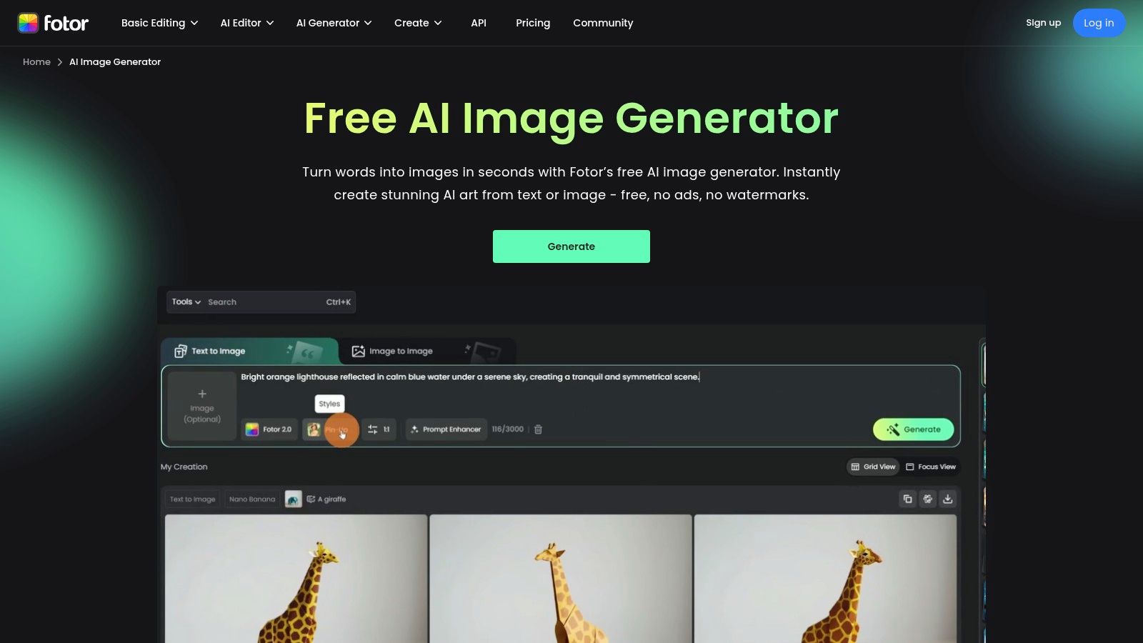 Fotor’s AI Image Generator integrates text-to-image capabilities into its well-established online photo editing and design suite. It stands out as one of the best free AI image generators for users who want an all-in-one platform for creating and then immediately editing visuals. While it may not have the raw power of specialized models, its convenience and generous initial credit offering make it a strong contender for casual users and marketers.