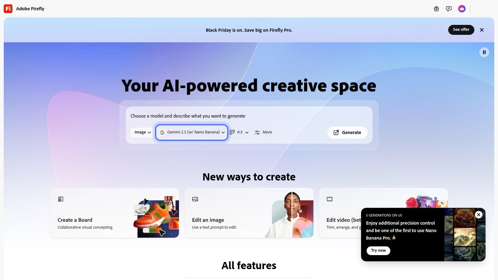 - Access: Sign up for a free Adobe ID to get started. The free plan includes 25 generative credits per month, which can be used across the Adobe suite for various AI tasks.