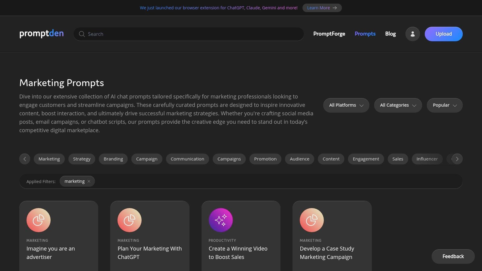 - Dedicated Marketing Category: Easily browse a wide selection of prompts specifically designed for marketing tasks like SEO, copywriting, video scripts, and social media management.