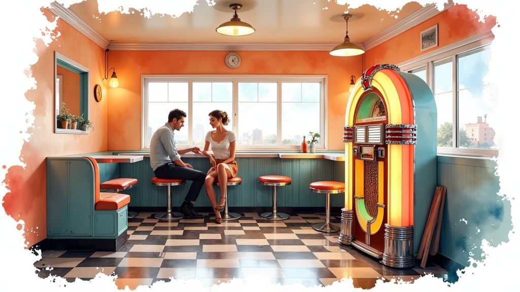 This structured approach gives the AI a complete sensory and historical brief, leading to a much more evocative and believable result than a simple request like "old-fashioned living room." These types of ai art prompt examples are perfect for creating unique brand visuals or artistic series.