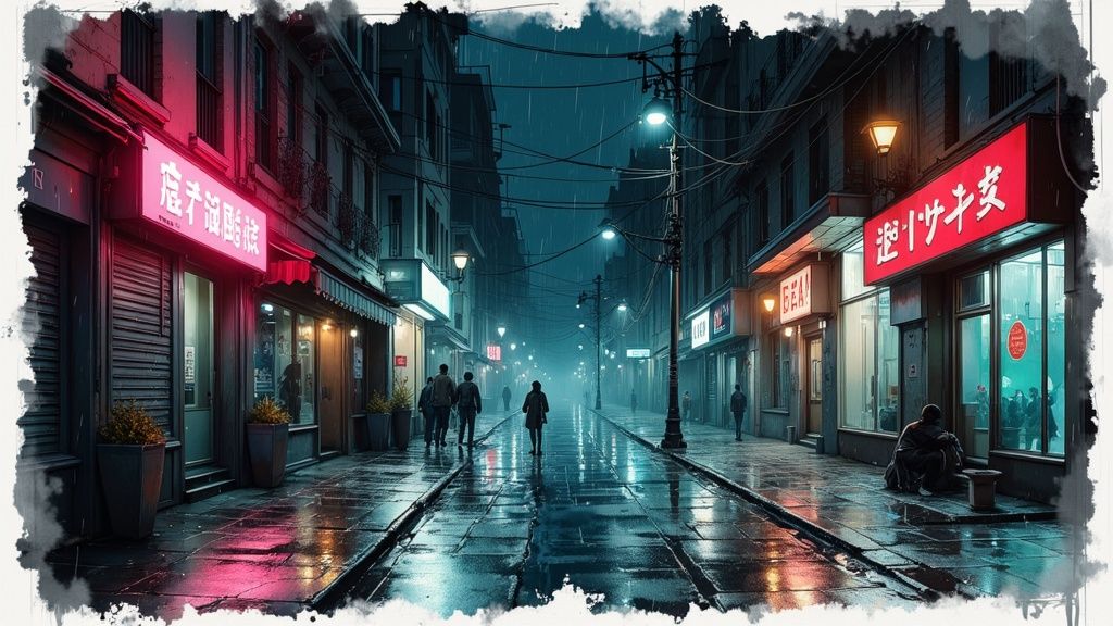 The core strategy here is narrative framing. You are using established visual tropes and styles that audiences instantly recognize. Referencing "in the style of Sergio Leone" immediately cues the AI to use wide shots, dusty color palettes, and intense character focus. These types of ai image prompt examples are effective because they tap into a vast library of cinematic data, allowing the model to replicate complex moods and aesthetics with just a few key phrases.