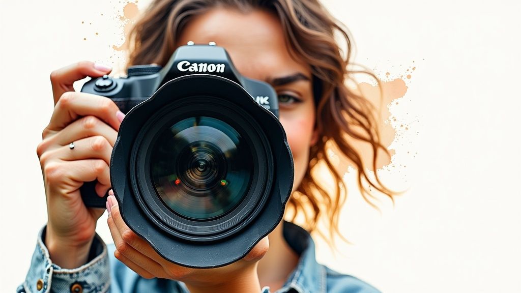 The strategy is emulation. By using terms like "85mm lens," "f/1.8 aperture," or "Kodak Portra 400 film stock," you instruct the AI to replicate the unique characteristics of that specific equipment. This gives you unparalleled control over technical attributes that define a photograph's aesthetic, such as depth of field, lens compression, and color science. These ai image prompt examples bridge the gap between imagination and the technical execution of professional photography.