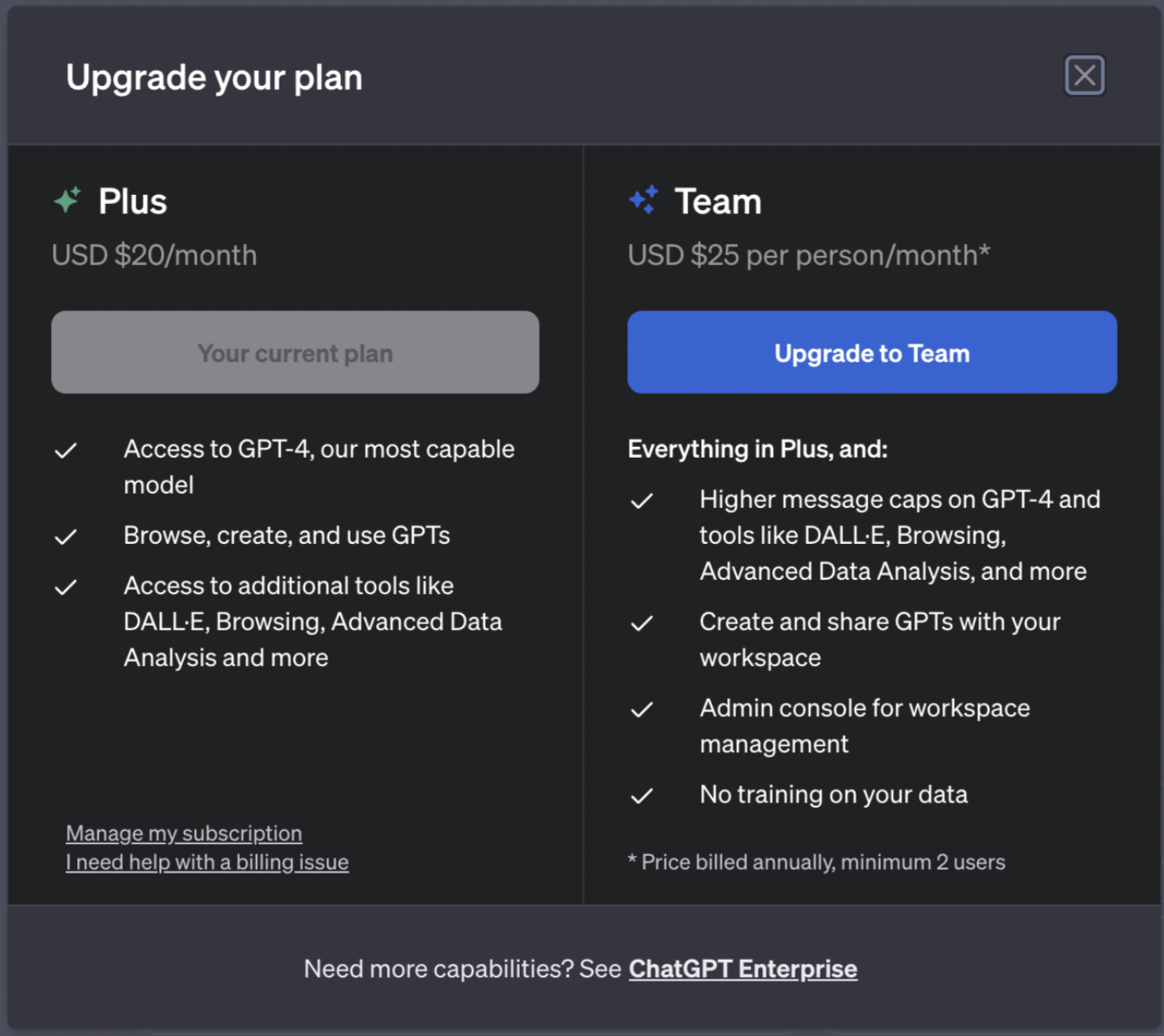ChatGPT Plus and ChatGPT for Teams are exclusive subscription tiers that provide enriched features and capabilities. The tiers are designed to suit the needs of individual users, teams, and enterprises: