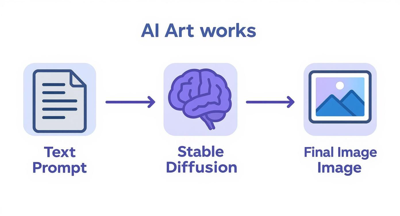 Before you can really get good at this, you need to understand what’s happening under the hood. Stable Diffusion isn't some magical artist with its own imagination. It’s more like an infinitely knowledgeable art historian that has seen millions of images but has zero creative spark of its own. It’s completely reliant on your words to piece concepts together.