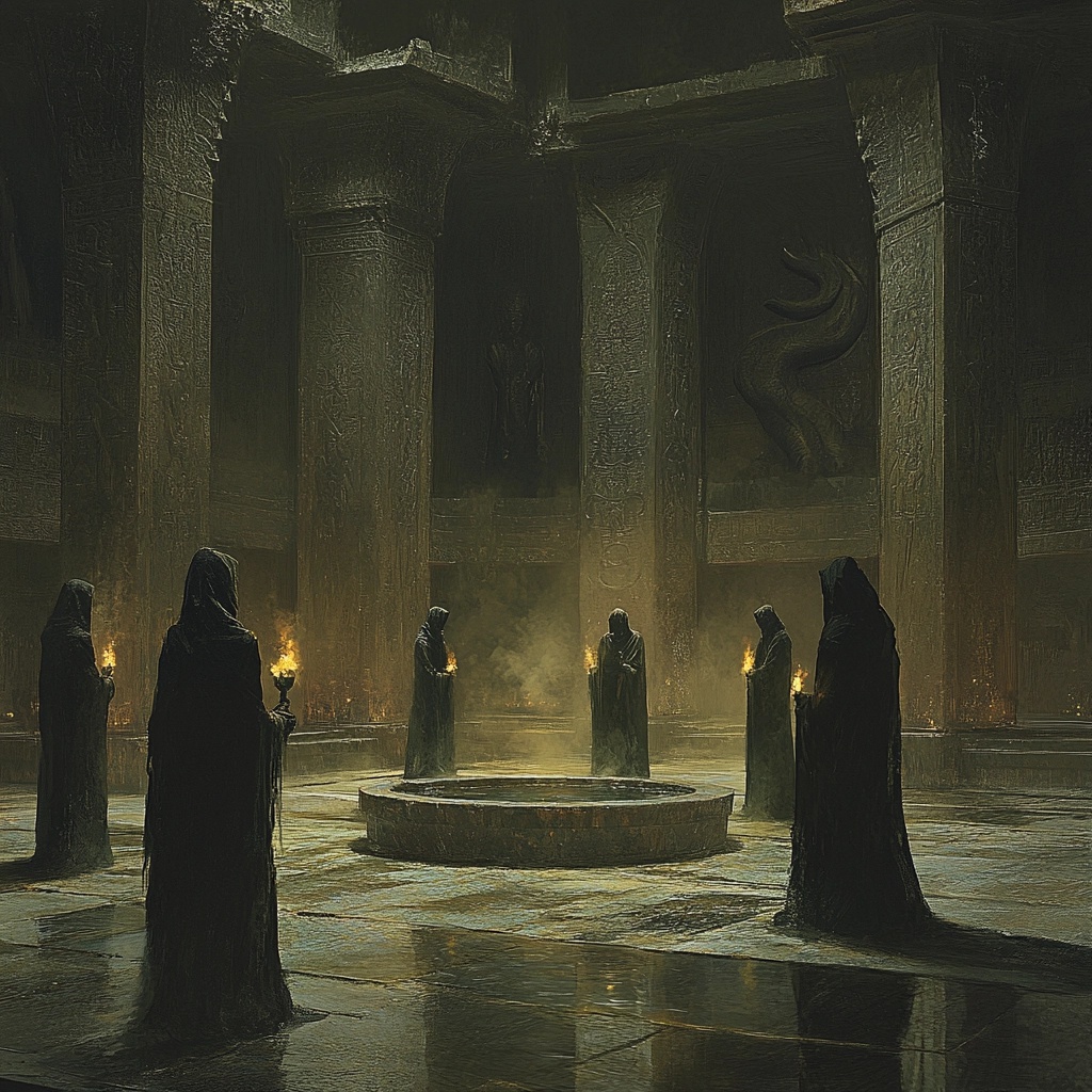 In a shadowy temple where ancient secrets linger, hooded figures gather, illuminating the darkness with their torches, surrounded by serpentine engravings that whisper tales of the past.