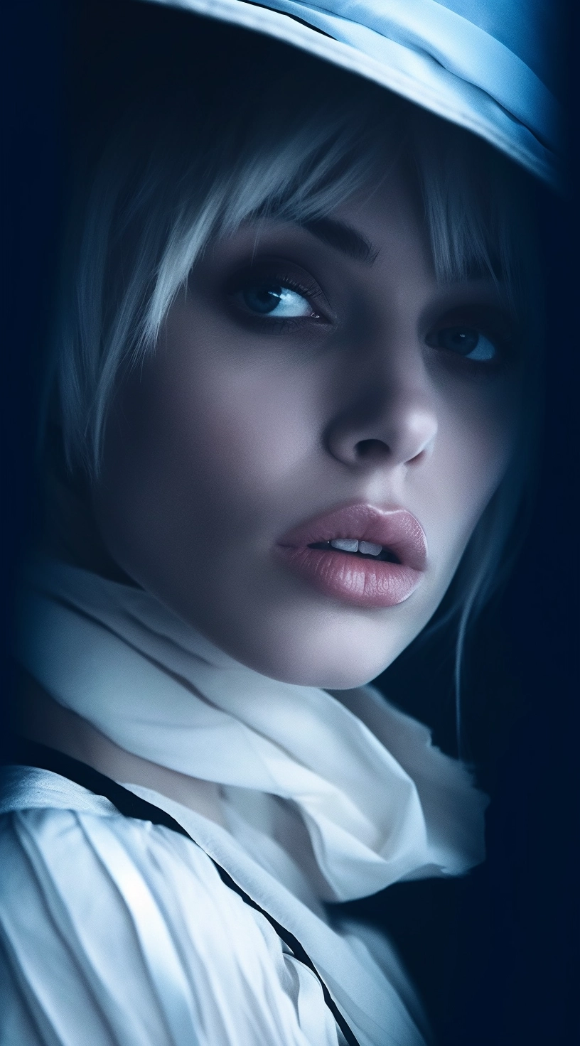 Exploring the depths of conceptual fantasy through minimalist and avant garde fashion photography, capturing the intricate details of a hypnotic closeup face portrait in a pensive stillness.
